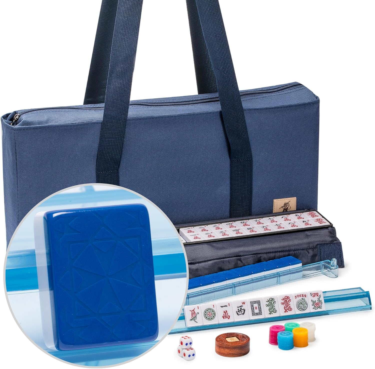 We also love this set from Amazon, which features 166 melamine tiles. In addition, the set comes with four tile racks with pushers, three dice, a set of chips, and a bettor, along with a stylish zippered bag and sleeves for the racks and tiles. We especially love this set because the tiles have blue backs and because the bag stands out from the many sets with floral quilted bags. Take me to the set!